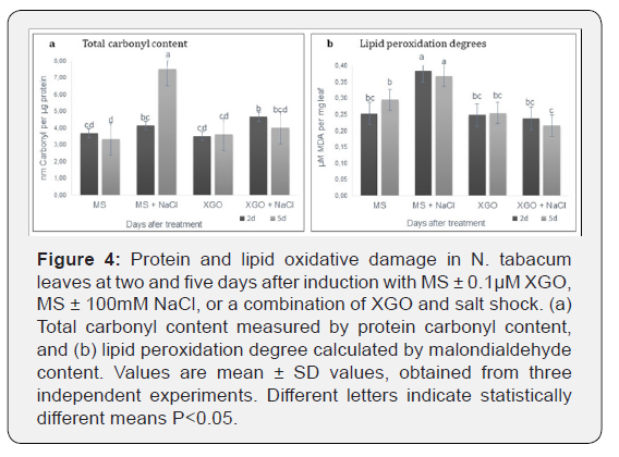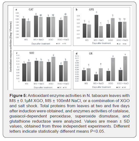 most common osmolyte for osmoprotection [47]. The higher accumulations of proline recorded with XGO and NaCl at five days after